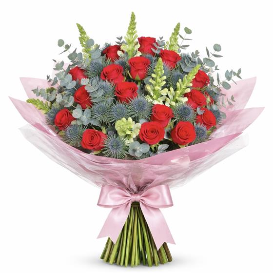 A striking contrast of Velvety Crimson Red Roses, Deep fuchsia Pink Roses, Bold Blue Thistle and White Snapdragon; complimented with luxury seasonal foliage. A bouquet designed to hold a timeless and contemporary modern feel.