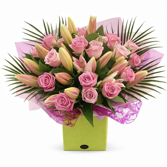 An elegant blend of Aqua Pink and Pale Pink Roses alongside Pink Lilies and complimented with a collar of Palms leaves.