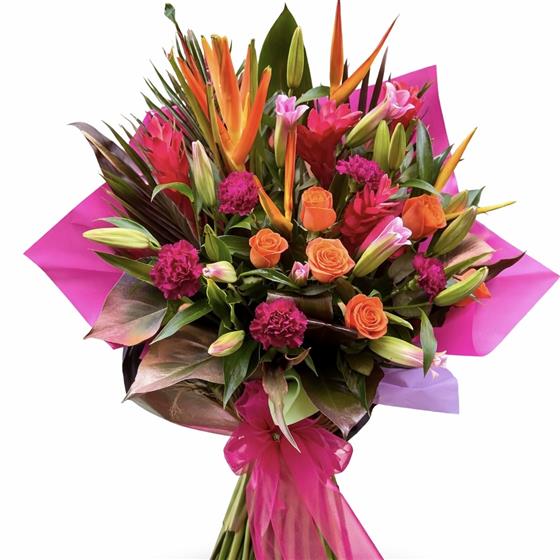 A lavish blend of sculptural tropical flowers and classic Roses, combining Bold colour with soft elegance and complimented with luxury seasonal greenery. A true statement bouquet with depth and personality.